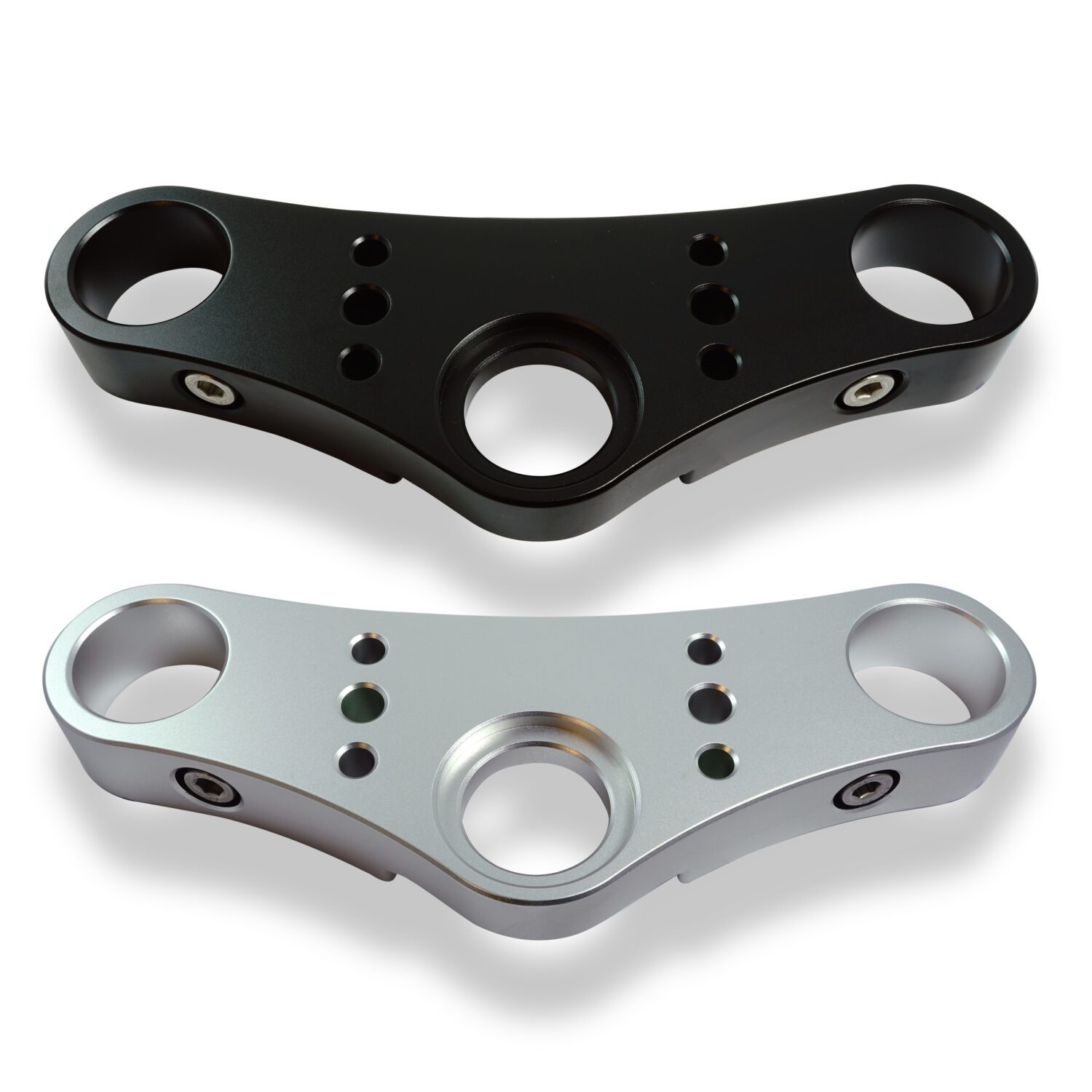 This high quality triple tree clamp is CNC machined out of a single piece of aircraft grade aluminium. After machining the triple tree clamp undergoes a series of surface treatment steps including anodizing. The result is a smooth satin finish that is both scratch and weather resistant. Perfect for a scrambler motorcycle build or any other custom build, where you wish to use bars.