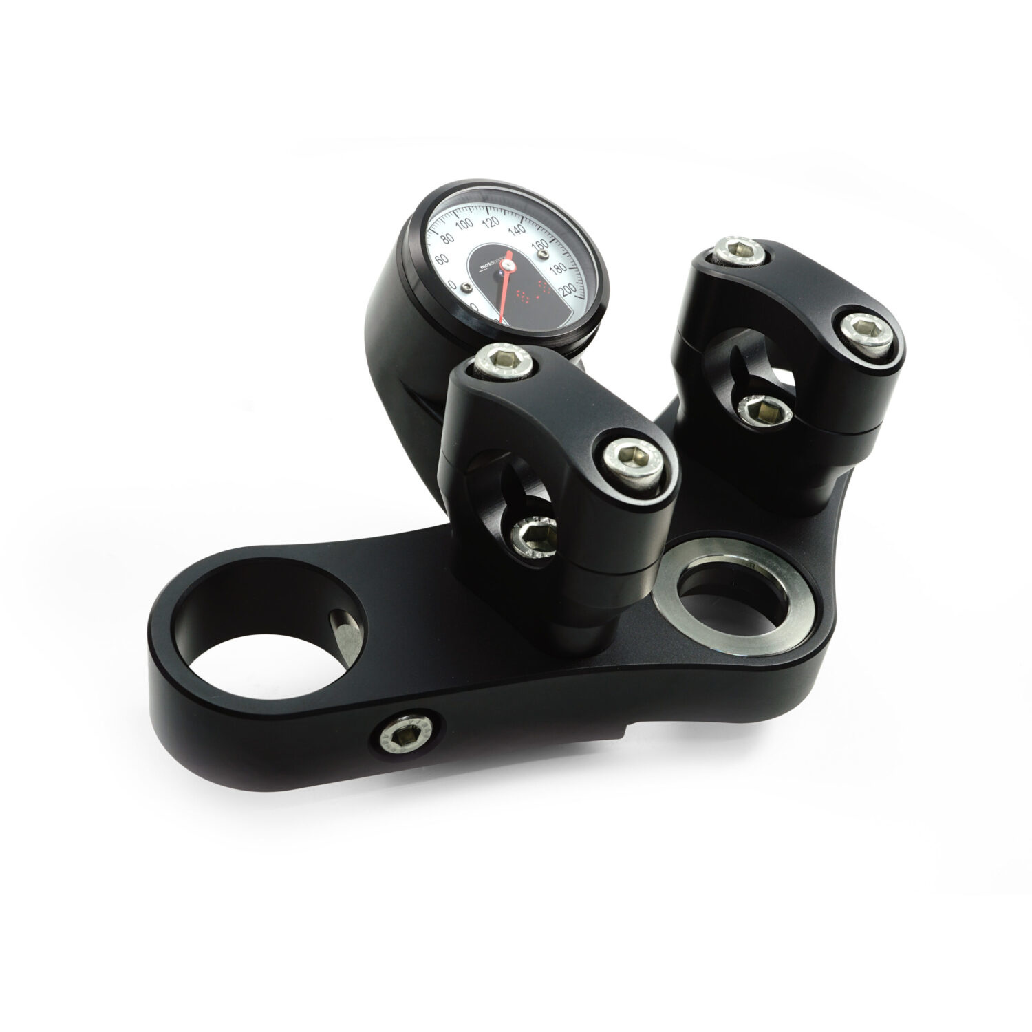 At the bottom of the triple tree clamp there are three M8 holes, which can be used to mount a speedometer or any other parts you wish to have installed. Ignition lock or a bracket for the choke, for example.
