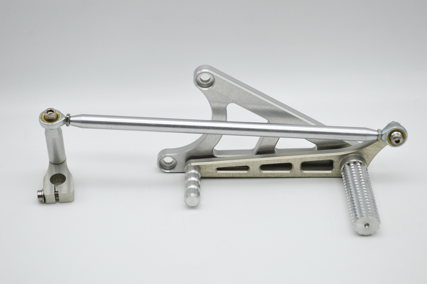 Complete Rearset kit for BMW K100. This set has all the parts that are needed. Shift lever, foot rests, brackets even a brake pump! It is a plug & play version! The quality is superb and the look is excellent. It is a must have for your BMW K project.