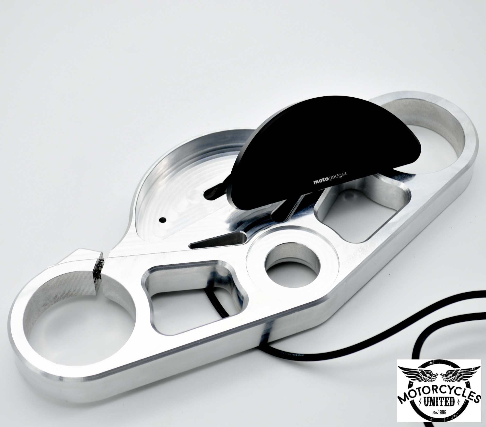 The yoke is made like the original top with the difference that it is possible to mount a Motogadget PRO speedo. The price does not include the speedo.