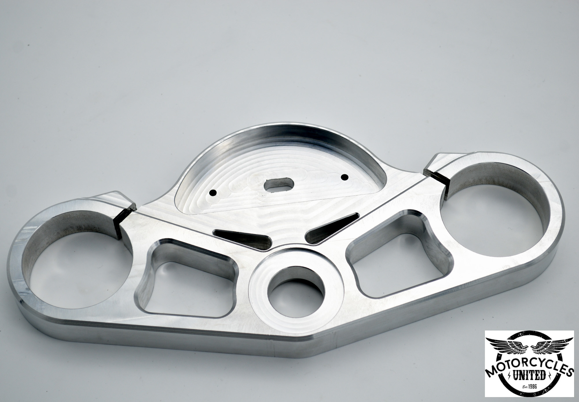 A super nice CNC-milled triple clamp for the BMW K100. This triple clamp as a mounting hole in it for a Motogadget dashboard such as the Motoscope Pro.