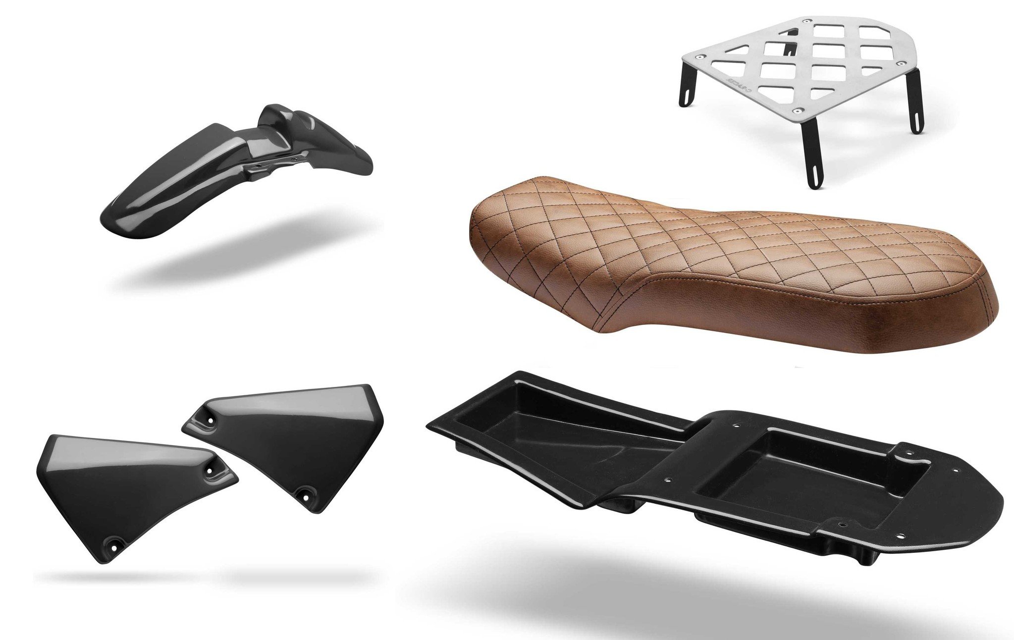Fits perfectly on your BMW k75 or k100 from 1982 to 1995. Kit comes with Seat (with handy under tray and metal base), a front fender, a set of front side covers and a seat cowl OR the luggage rack, depending what style you prefer.