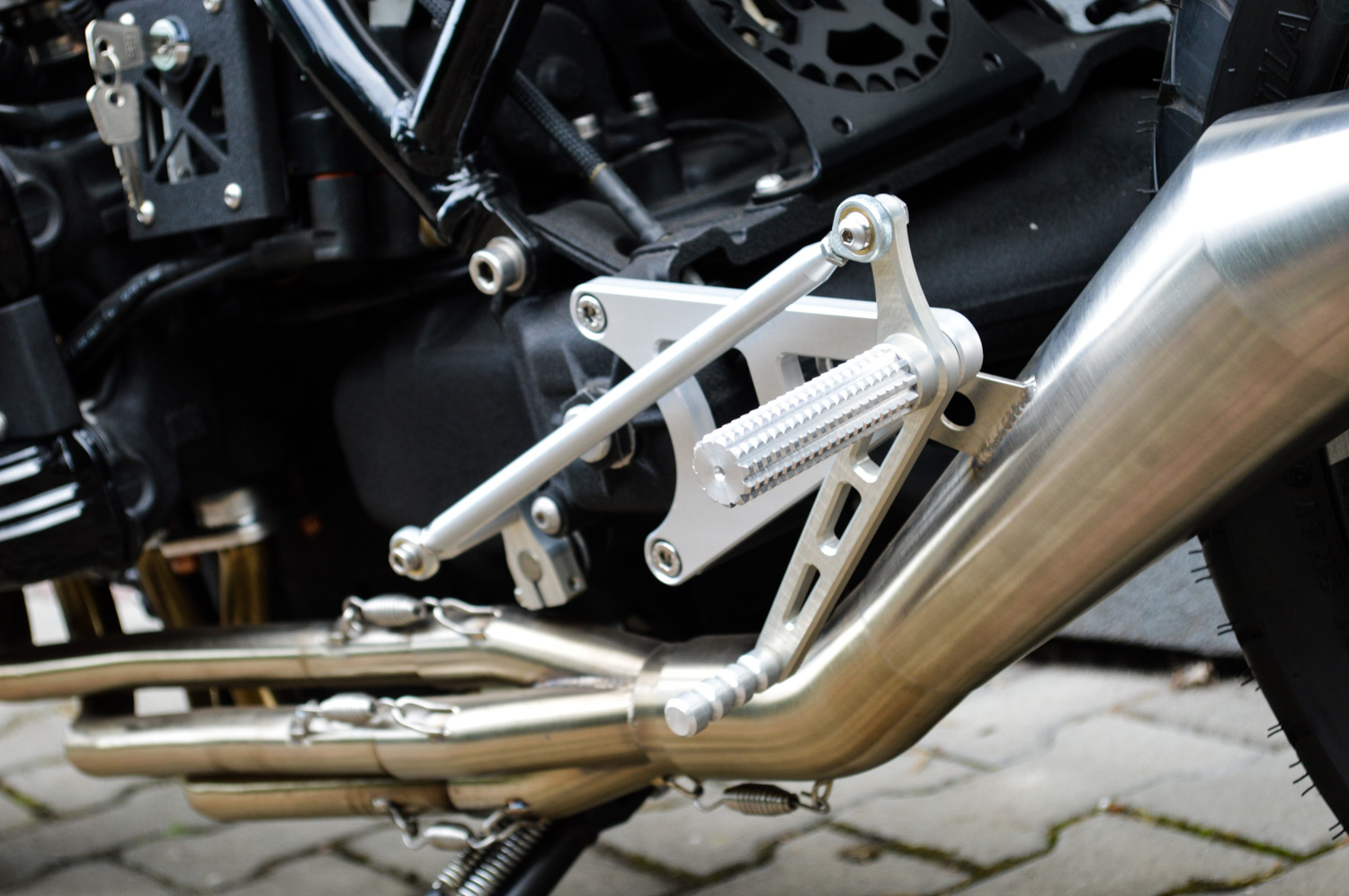 Complete Rear Set kit for BMW K75. This set has all the parts that are needed. Shift lever, footrests, brackets even a brake pump! It is a plug & play version! The quality is superb and the look is excellent. It is a must have for your BMW K project.