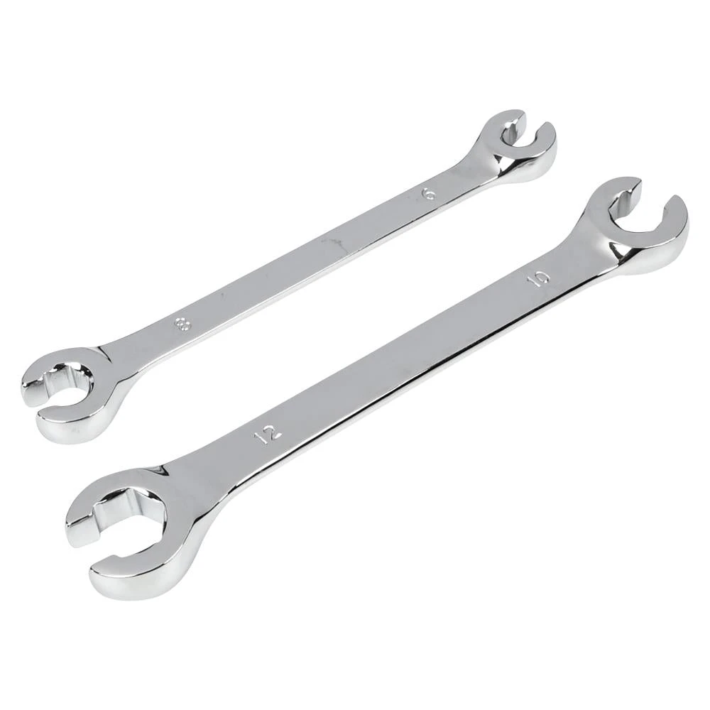 This 2-piece brake line wrench set is specially designed for safely and precisely tightening and loosening brake lines and other delicate fittings. The wrenches feature an open-end ring design with a hexagonal grip, allowing them to grip the line securely without damaging it. This makes the set ideal for use on brake systems, hydraulic lines, and other applications requiring precision and care.