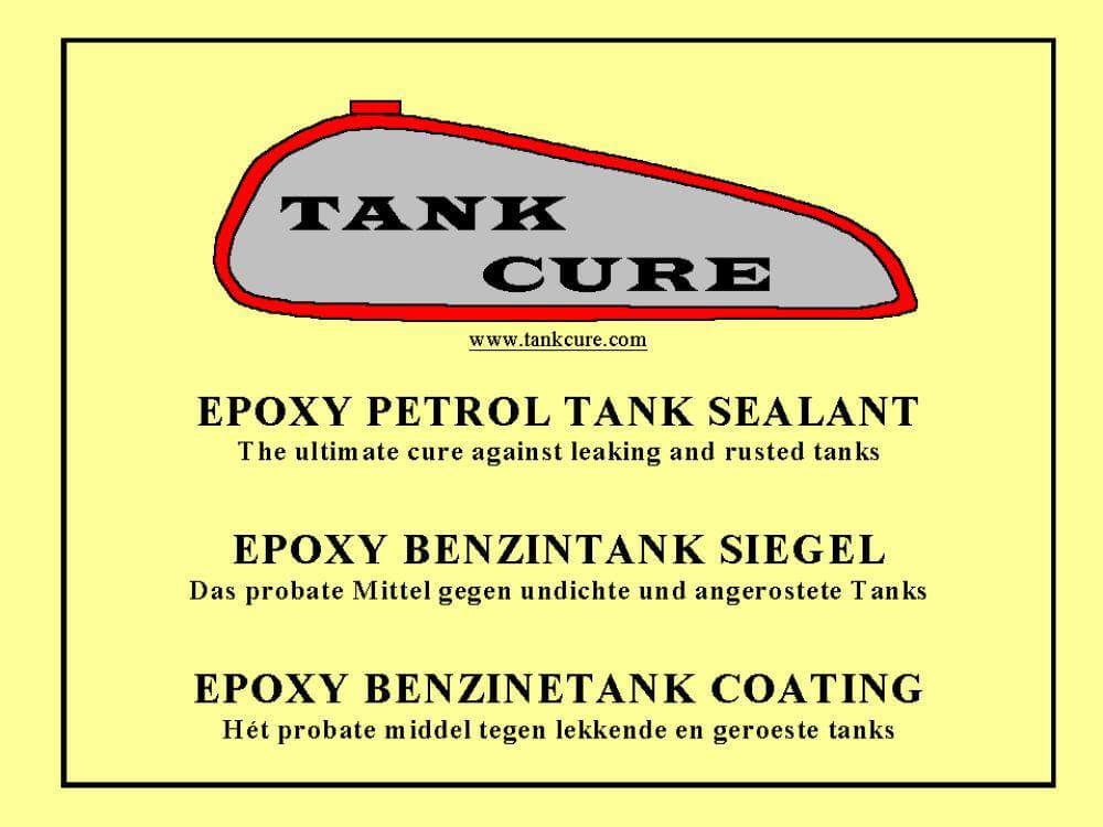 "TANK CURE" tank sealant is based on a 2 component epoxy resin. After adding the two components together stir them thoroughly for a couple of minutes, empty the can in your petrol tank and seal the filler opening properly. Now slowly turn the tank in all directions. Keep turning for about 15 to 20 minutes. The sealant should touch all surfaces several times to form a good layer. Now open the filler cap and put the tank upside down to drain as much sealant as possible.