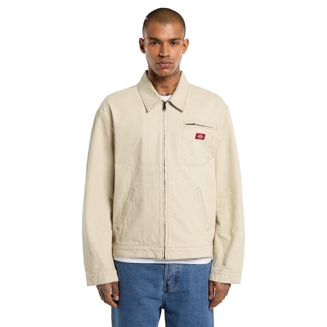 The Dickies Hickory Painter Jacket is a relaxed-fit work jacket made from sturdy 12.3oz garment-washed hickory cotton with a soft hand feel. It features a left chest welt pocket with zip entry, slanted bottom welt pockets, a centre front zip, back pleats, adjustable hem and cuffs, and a woven Dickies label on the chest pocket. A timeless painter jacket built for comfort and durability.