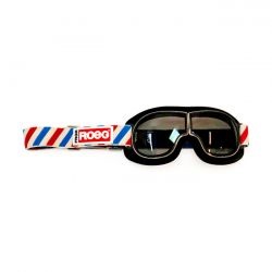 The ROEG® Jettson Helix "old school" moto goggle fuses vintage moto design with modern styling and technology resulting in a timeless look with next level performance. The goggle meet the CE EN1938:2010 regulations suitable for motorcycle use. The Chrome goggle frame is finished with 100% Premium Cowhide and fitted with a grey anti scratch lens and a 35mm woven striped red/white/blue strap.