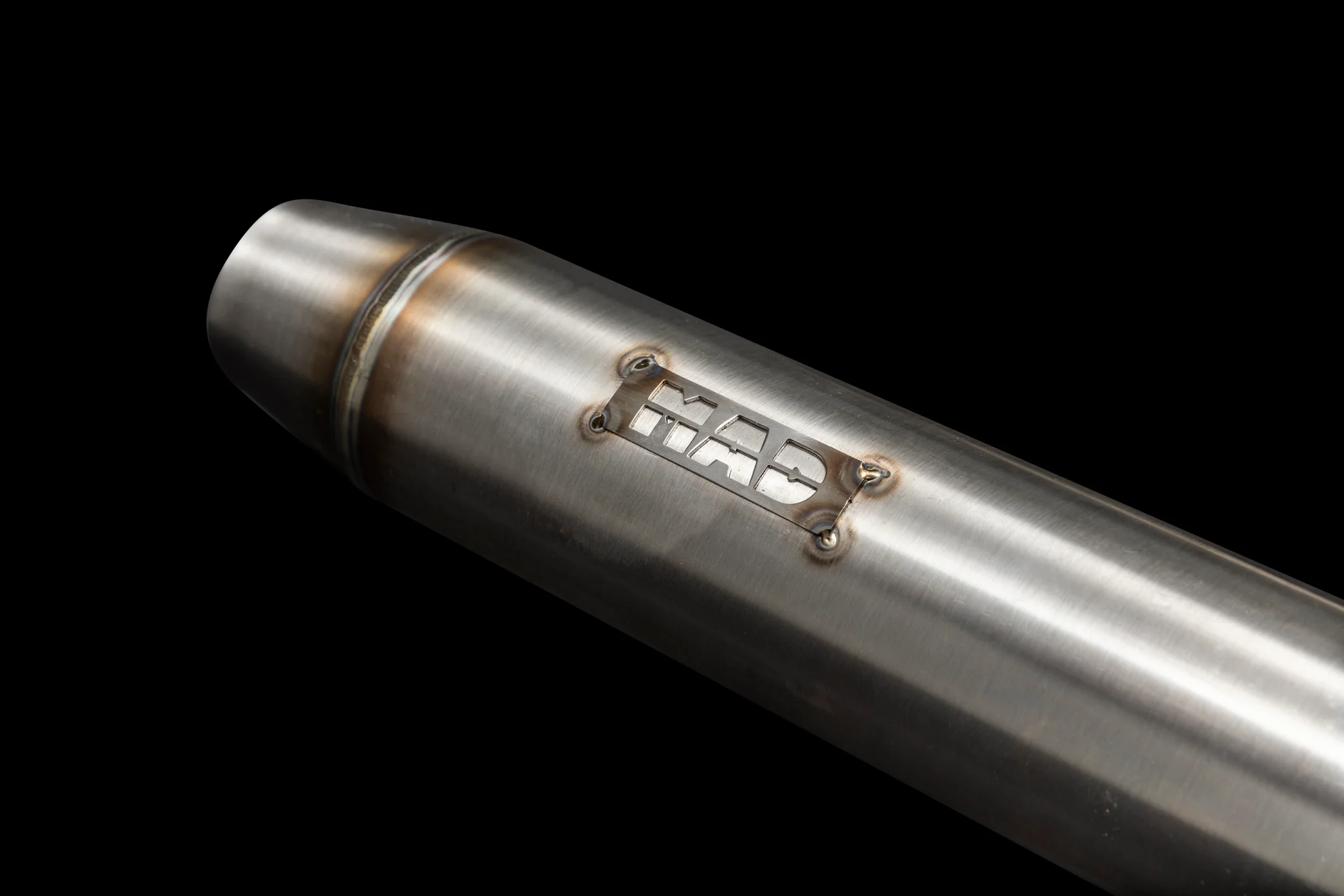 The exhausts are constructed of high-grade stainless steel. The dual exhaust system's tubes have a diameter of 50,8 mm, and it includes integrated hand-shaped mufflers and DB killers.