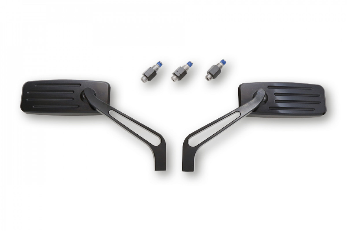 High quality CNC-milled rectangular mirror with a black anodized aluminum head. Includes extra adapter M10 x 1.25 mm with left-hand thread for Yamaha.