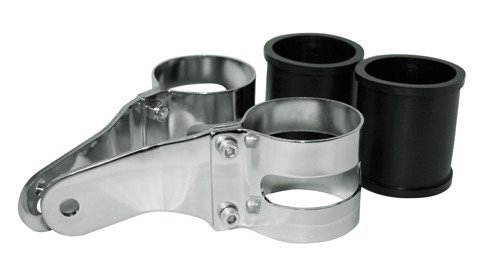 Universal headlight bracket, chrome, with distance rubber, pair. For fork tubes from 43 to 47 mm. Arm length is 90 mm (centre of the hole). Clamp height 60 mm, mounting hole 10 mm.