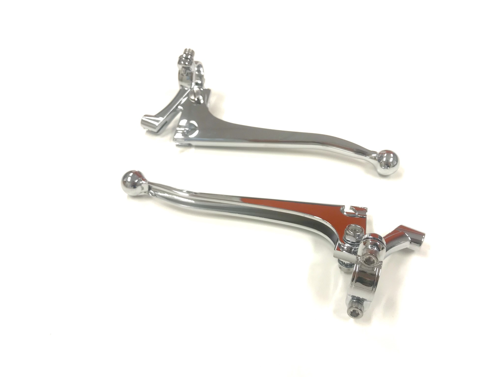 Boxed Pair of 7/8" Ball Ended Levers Without Cable Adjusters. (1-1/16" pivot centres) Premium quality chrome plate & fixing screws. Fitted as OE to Some Norton and Velocettes.