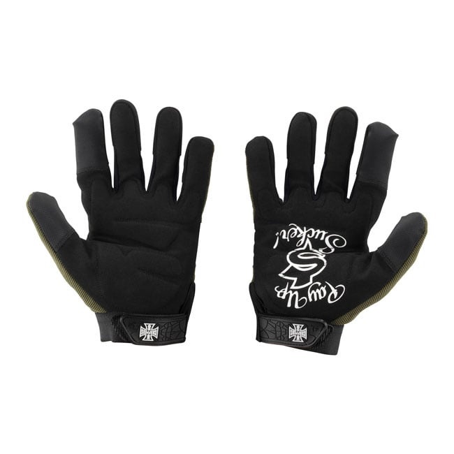 Pay Up Suckers Gloves provide attitude as well as grip. The Olive/Black WCC gloves are constructed with both elegance and durability in mind. It Featuring the "Pay Up Suckers" pattern on the palm and the recognizable WCC emblem on top.