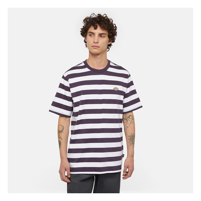 The Dickies Rivergrove T-Shirt is a regular-fit short sleeve crewneck made from soft and breathable BCI certified cotton jersey. It features all-over horizontal block stripes in seasonal colours and is finished with a woven Dickies label on the chest. A simple everyday cotton tee with a clean collegiate feel.