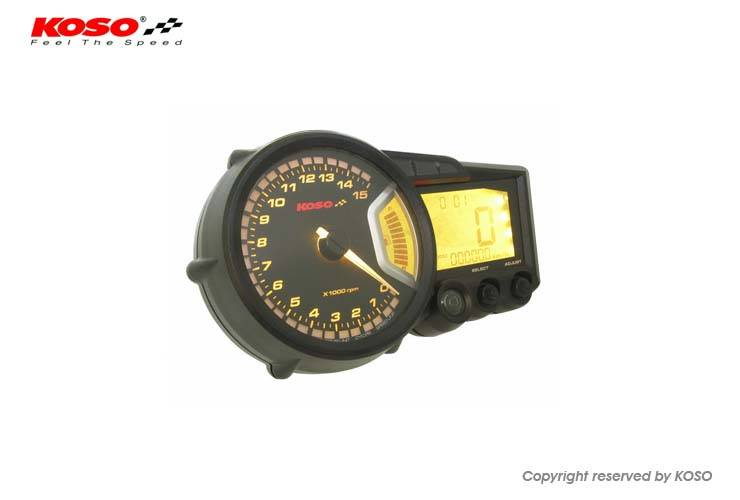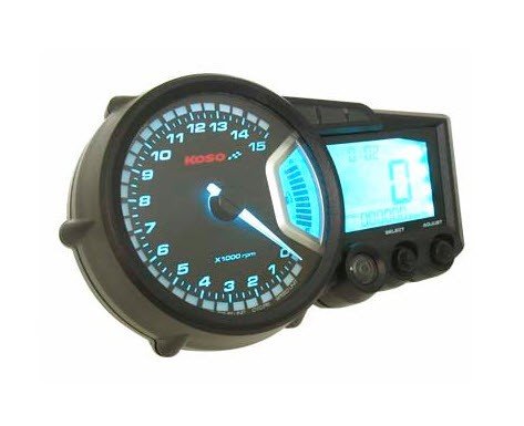 KOSO RX2 Cockpit. KOSO digital Multifunction Cockpit RX 2 with 5 control lights, choice of 7 different background illumination colours, Speedometer / Tachometer / odo / trip / oil- and water temperature and so on. Universal sensor and bracket are included. With the English manual. Homologated