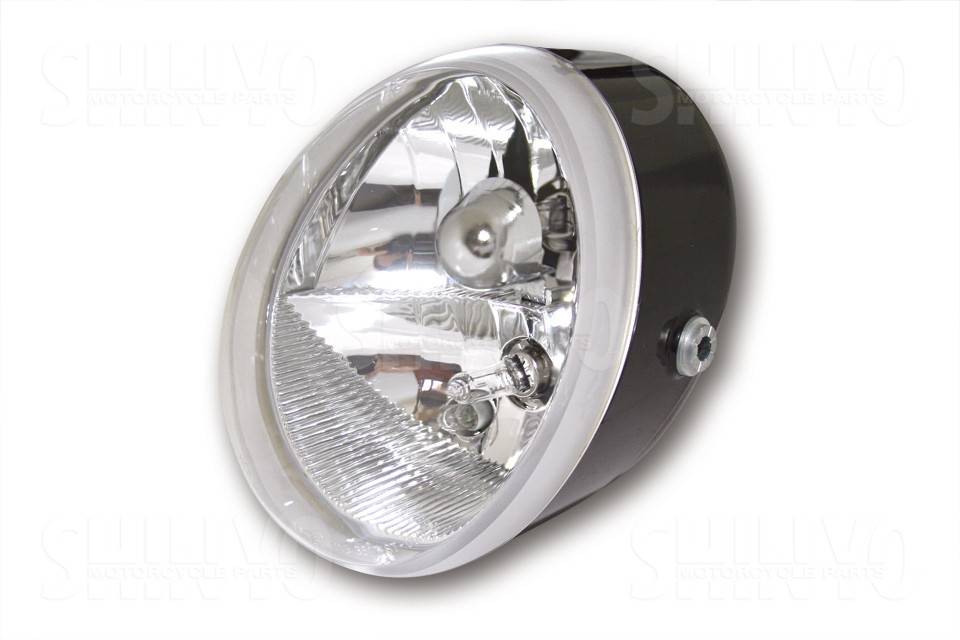 Asymmetric headlight in V-Rod style with black plastic housing and side mount, E-marked.