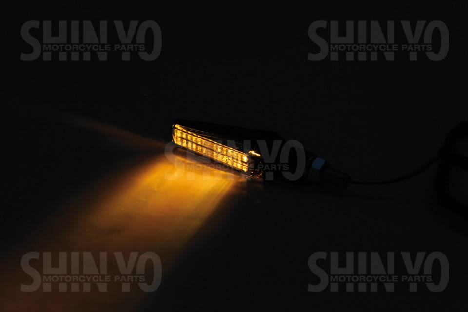 Black sturdy plastic housing with rubber stem and smoke lens, E-marked for front and rear.