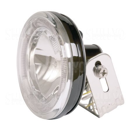 Round driving light in metal housing with clear lens and adjustable bracket, E-marked.