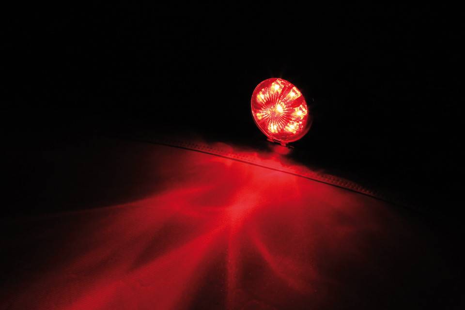 Black metal housing with a chromed rim.Red lens and adjustable bracket, E-marked.