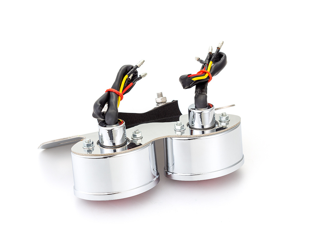 Double the fun with the taillight module "Ohio Chrome", A complete rear, brake and license plate light + holder. For that old school look on your cafe racer.