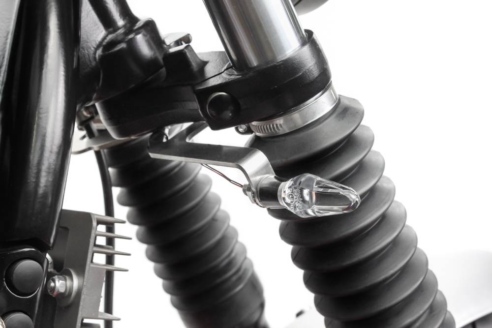 Plug and Play. Quick and simple. First, the voltage regulator on the lower triple clamp is removed. Then the turn signal holder by Two Hands Motorcycles are carefully fitted together with the voltage regulator in reverse order to use the supplied assembly material. Finally, your preferred turn signals can be mounted on the turn signal holder.
