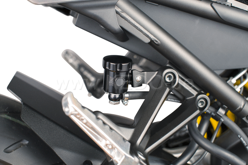 Wrenchmonkees "Monkeebeast" Aluminium Brake Fluid Reservoir Rear, Incl. Stainless Steel Bracket and Hose, Position: Passenger Footpeg Strut