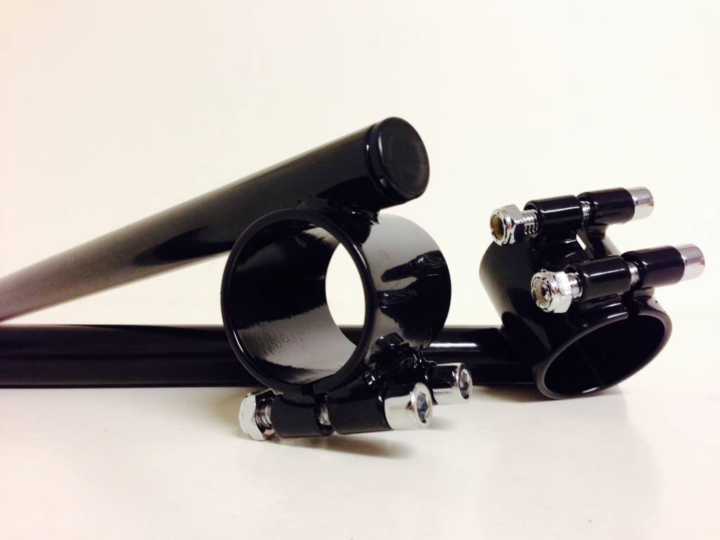 Pair of Black Universal 41 mm (1-5/8") Clip-on handlebars. Ideal for some years/models of Hinckley Triumph Bonnevilles, but can be fitted to almost any motorcycle with 41 mm fork tubes and 1" Controls.