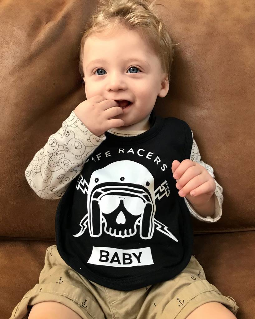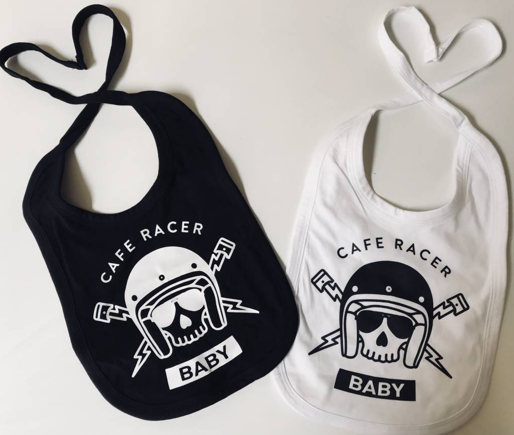 Bib Cafe racer Baby (select your colour). Super cute on your junior Biker or even for yourself if you tend to make a mess when you eat ! Available in black or in white.