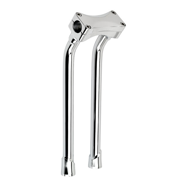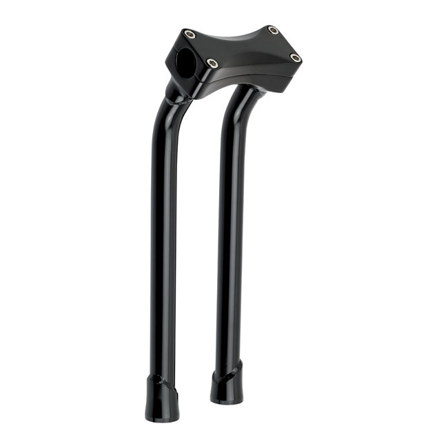 Tiene acabados galvanizados en negro o cromo y viene con aprobación. Es adecuado para manillares de 1-1/8 (28,6 mm). Viene con 2"(51 mm) Pullback, parte superior de acero fundido a la inversión y construcción inferior roscada. Los tubos verticales están hechos de tubos de cromoly 4130 de 3 mm de espesor, sin costura, soldados con TIG con orificios de montaje roscados de 1/2-13 que aceptan pernos verticales estándar. Espaciamiento de 3-1/2" (89 mm) para adaptarse a la mayoría de los árboles triples superiores HD. Los soportes de tacómetro y velocímetro HD originales se ajustan al patrón de perno de abrazadera superior. El tipo específico de aprobación y validez para el modelo de moto y los años que figuran en el informe de prueba deben confirmarse con el distribuidor de MCS de su vecindario o con el departamento de ventas de MCS.