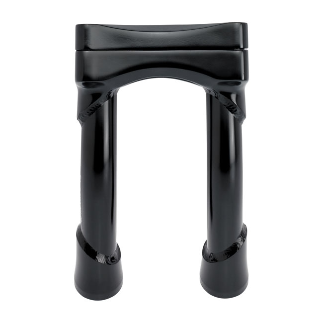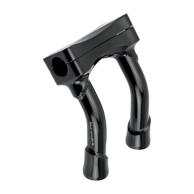Tiene acabados galvanizados en negro o cromo y viene con aprobación. Es adecuado para manillares de 1-1/8 (28,6 mm). Viene con 2" (51 mm) Pullback, parte superior de acero fundido a la inversión y construcción inferior roscada. Los tubos verticales están hechos de tubos de cromoly 4130 de 3 mm de espesor, sin costura, soldados con TIG con orificios de montaje roscados de 1/2-13 que aceptan pernos verticales estándar. Espaciamiento de 3-1/2" (89 mm) para adaptarse a la mayoría de los árboles triples superiores HD. Los soportes de tacómetro y velocímetro HD originales se ajustan al patrón de perno de abrazadera superior. El tipo específico de aprobación y validez para el modelo de moto y los años que figuran en el informe de prueba deben confirmarse con el distribuidor de MCS de su vecindario o con el departamento de ventas de MCS.