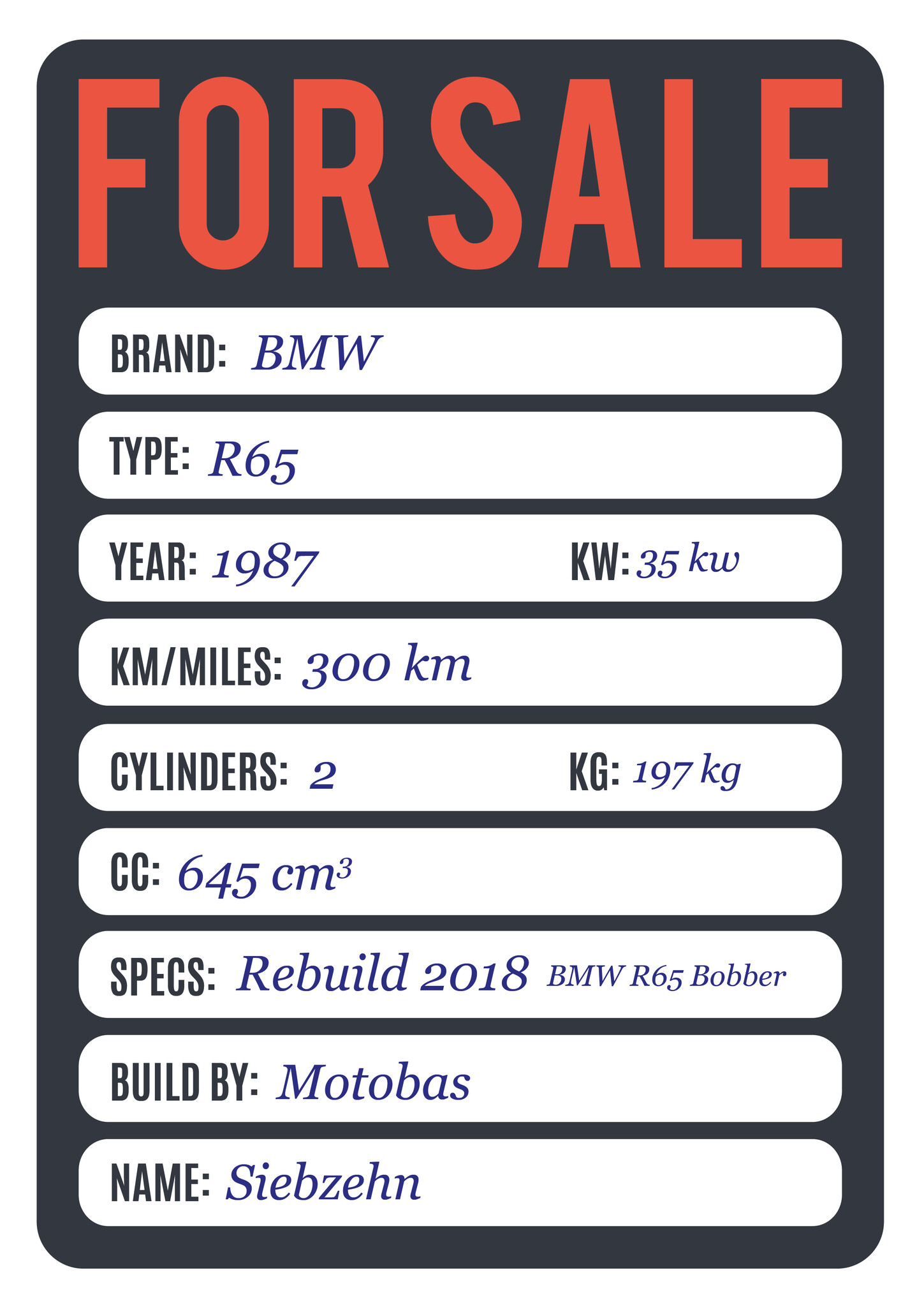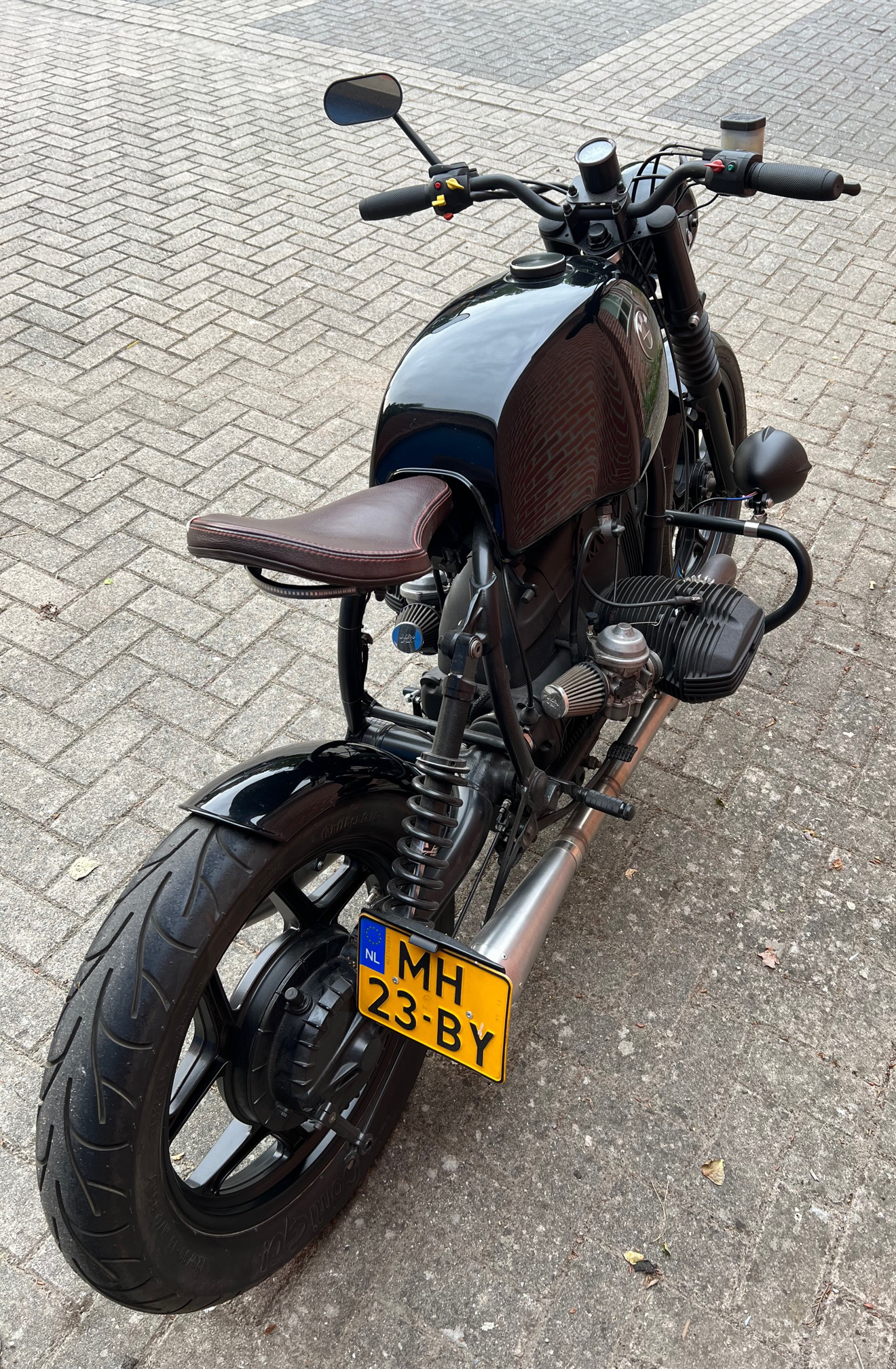 Una motocicleta BMW R65, que se mezcla con el estilo urbano cafe racer. Este motor está completamente detallado en 2018, con muchos detalles y diseño. De voorvork is gereviseerd y verlaagd. Los carburadores de gran tamaño y personalizados están equipados con filtros de aire abiertos. El motor está volledig gespoten, también el bloque (acabado mate). Het zadel voegt comfort en punta estilo hecha a medida.