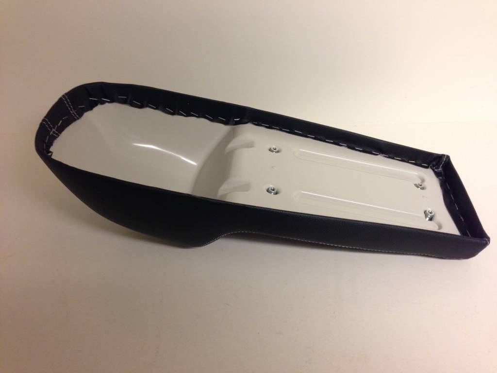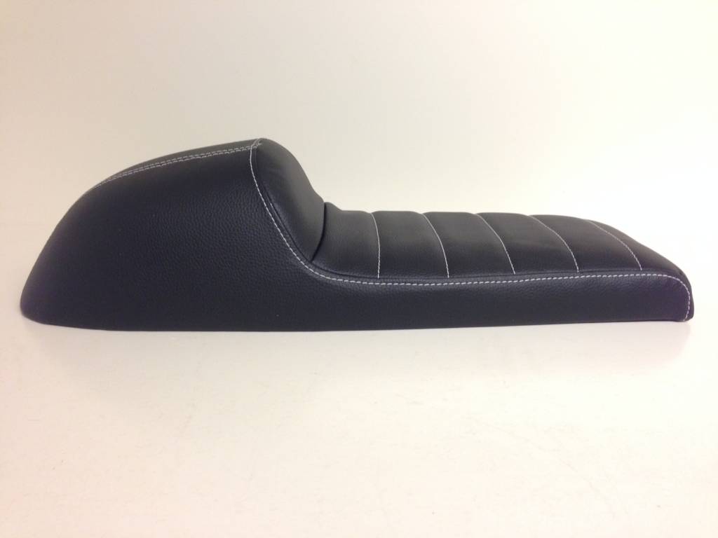 Upholstered Cafe Racer Seat Tuck N' Roll Black Type 34. This seat has an ABS plastic base which is entirely upholstered with black PU leather and finished with white stitching.