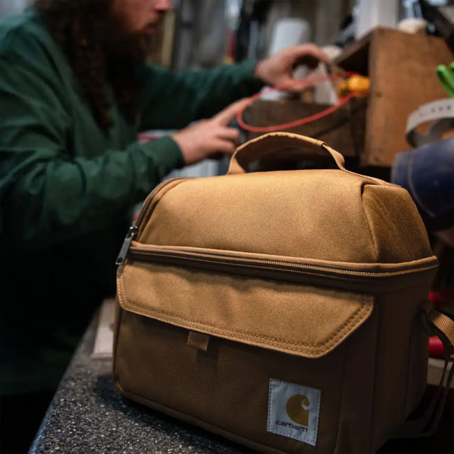 Esta nevera portátil Carhartt está diseñada para el trabajo y el uso diario, manteniendo tus alimentos y bebidas a la temperatura ideal durante horas. Fabricada con poliéster DWR de 600 deniers resistente y con acabado Rain Defender™, protege contra la lluvia ligera. Su práctico diseño incluye un compartimento superior independiente para mantener los artículos organizados y evitar que los alimentos se aplasten.