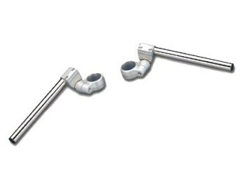 The High Rise and Low Rise versions are similar in design. Unlike normal clip-ons, these raise the bars up higher to provide a more relaxed riding position. The Low Rise model raises the bars 40 mm (1.6") higher than usual while the High Rise version raises the bars a full 70 mm (2.8") higher than usual. The handlebars provided are chrome plated steel (22 mm or .866" diameter) while the mounting parts are cast and machined aluminium. Black plastic plugs are provided for the open ends of the handlebars. Usable handlebar length for mounting brakes, throttle, and other items are 222 mm (8.75"). For those who prefer a lighter aluminium handlebar for use with both the high rise and low rise clip-ons, we offer that item as an accessory part in Clip-on Parts.