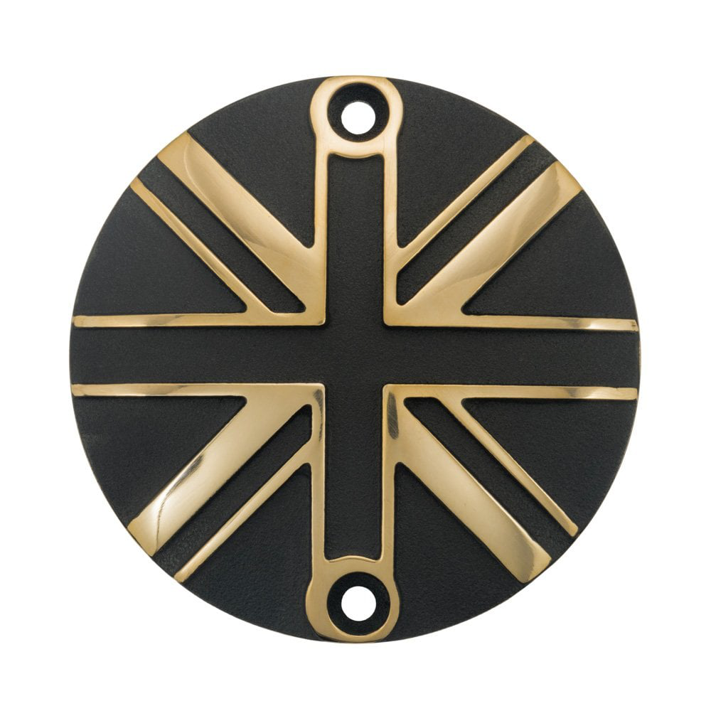 Cubierta / Insignia Motone Clutch (LHS) con Union Jack en relieve en contraste de latón sobre acabado negro Krackle. Esta cubierta es para el lado del embrague (la insignia redonda más grande en el lado izquierdo de la moto).