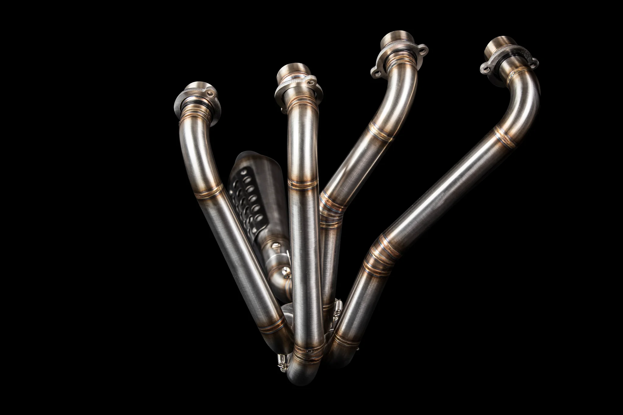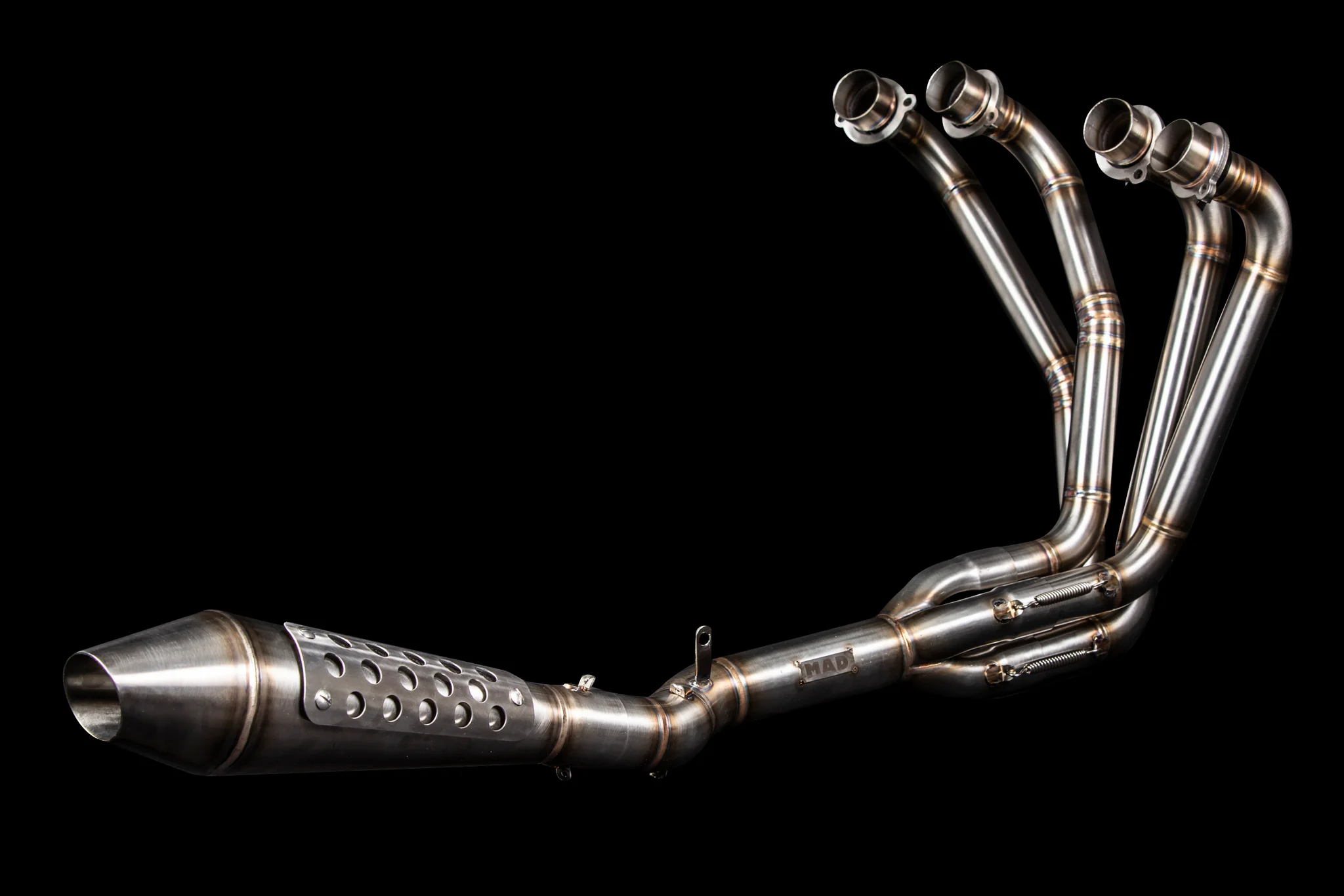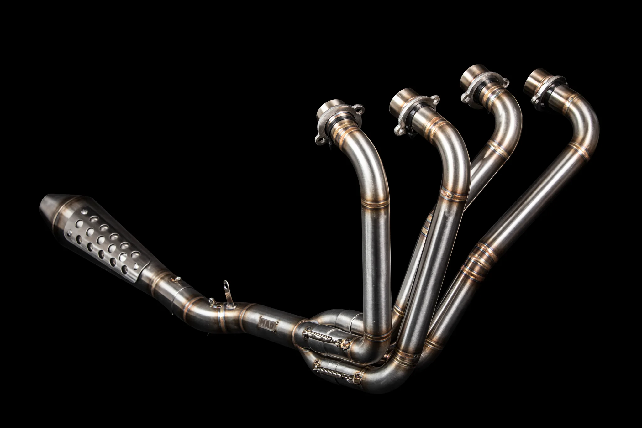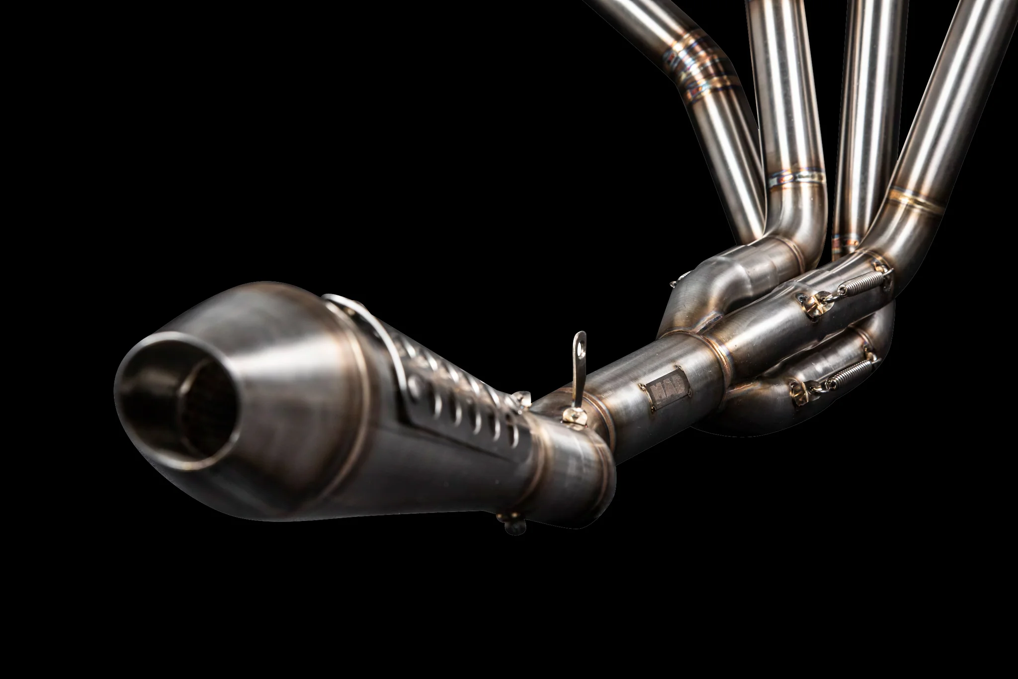Los escapes son de acero inoxidable. El silenciador se fija en una brida de 50,8 mm, y los tubos tienen un diámetro de 38 mm. Usted tiene la opción de recibir el escape con o sin silenciador.