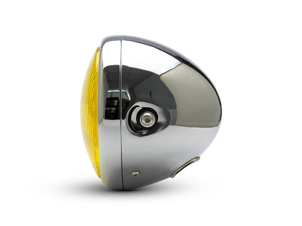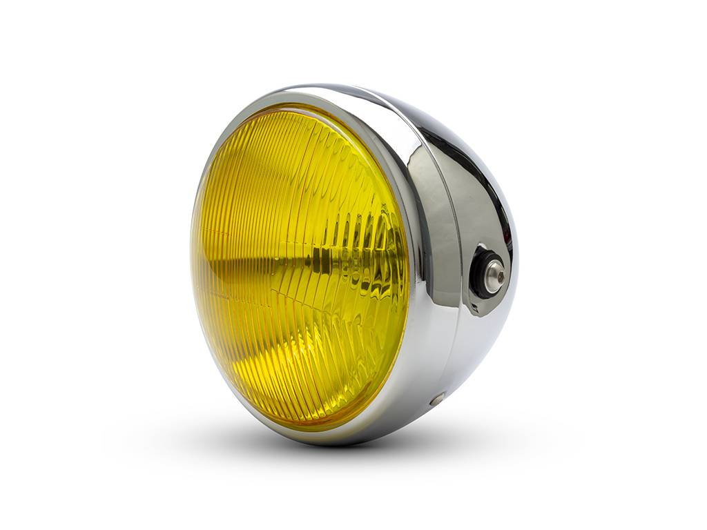 High-quality classic-style side-mount headlight featuring a yellow headlight, halogen bulb and a full-metal housing. This headlight will suit fussy buyers who are looking for a quality product.