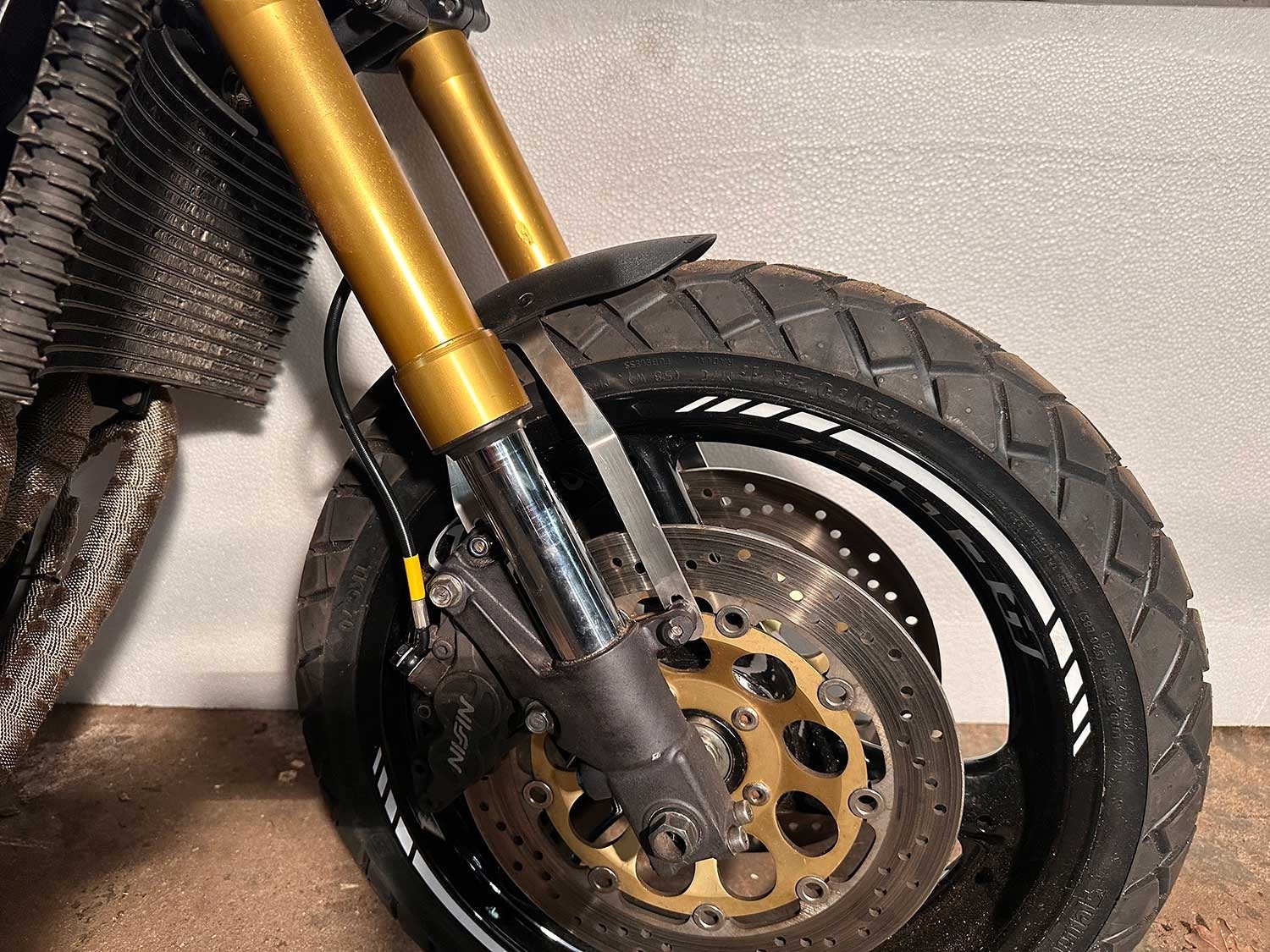 Estos guardabarros delanteros de bonito acabado están hechos especialmente para motos custom con una conversión de horquilla GSX-R. Los guardabarros negros son muy prolijos debido al acabado texturizado. Los soportes están hechos de acero inoxidable de 3 mm, y pueden ser rociados en color si se desea. Debido a que los soportes tienen un agujero ranurado, el guardabarros es ajustable en altura.