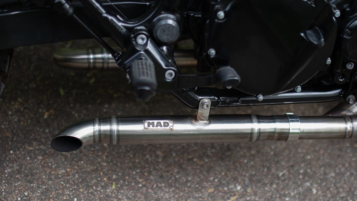 - escape: sistema de escape personalizado de acero inoxidable con silenciadores MAD con corte diagonal.