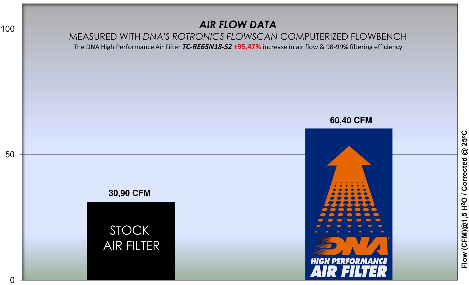 - DNA air filter flow: 60.40 CFM (Cubic feet per minute) @1,5"H2O corrected @ 25degrees Celsius.