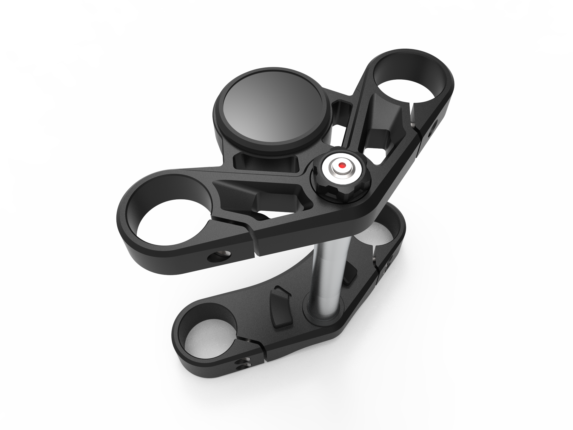 - Árbol triple de aluminio anodizado en negro con topes de dirección ajustables y soporte para divisor de línea de freno