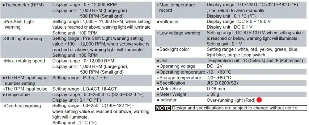- Rango de ajuste del aviso de sobrecalentamiento: 60 ~ 250°C (140 ~ 482°F)