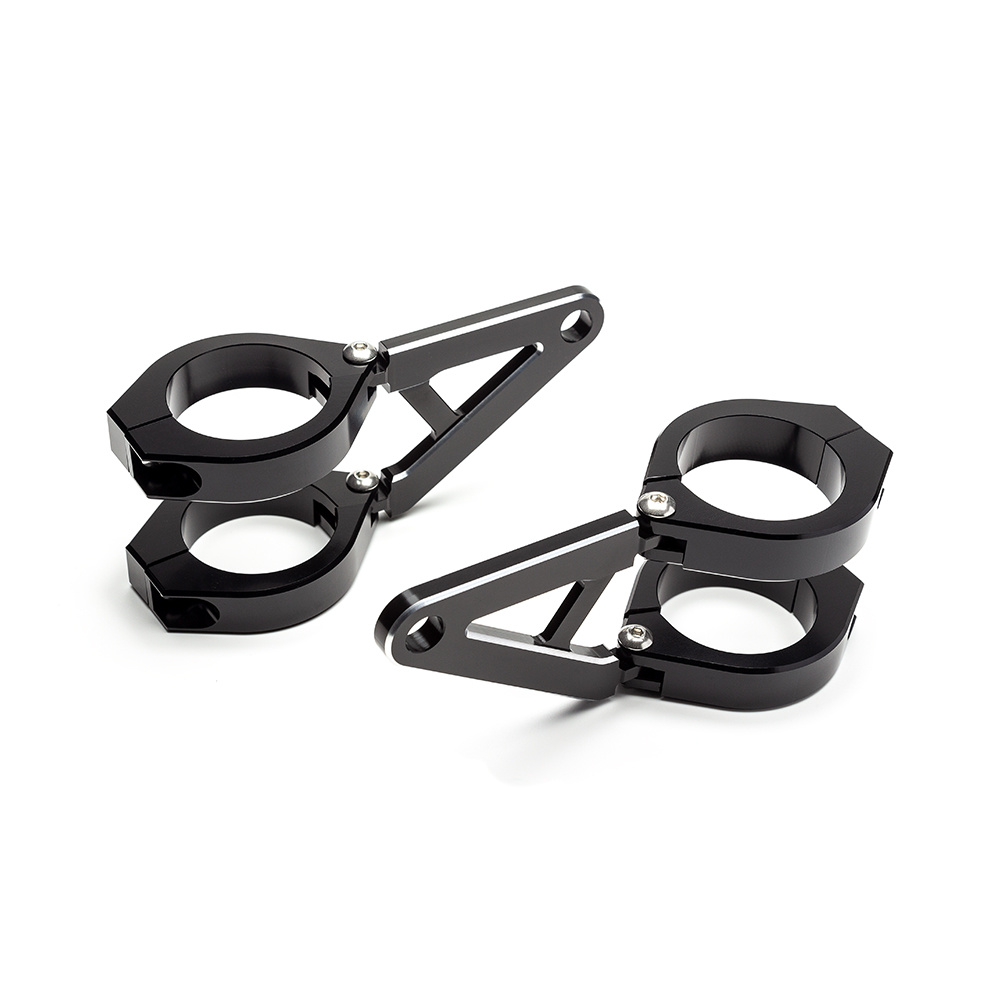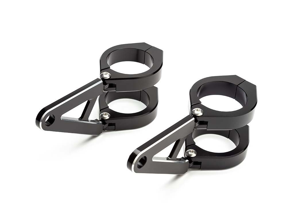 Each fork clamp comes in 2 separate pieces, allowing them to clamp onto the forks down without having to remove them from their yokes.