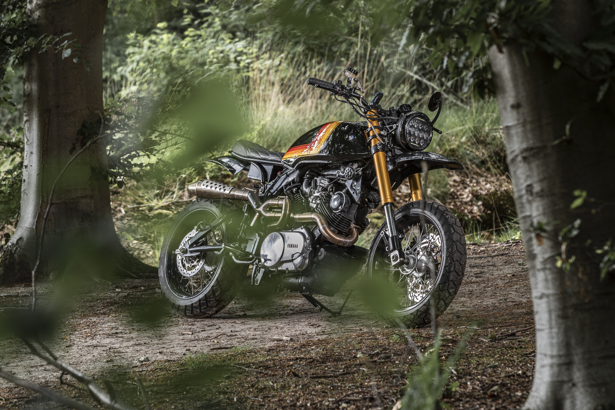 El escape ideal para tu Yamaha XV, Virago, o TR1 scrambler. Un escape diseñado para ir bien con su scrambler, brat, o la apariencia de caferacer off-road. El escape está diseñado para ser tan estéticamente agradable alrededor de su motor como sea factible. Los dos tubos colectores se enredan entre sí antes de unirse en el exclusivo silenciador Scrambler.