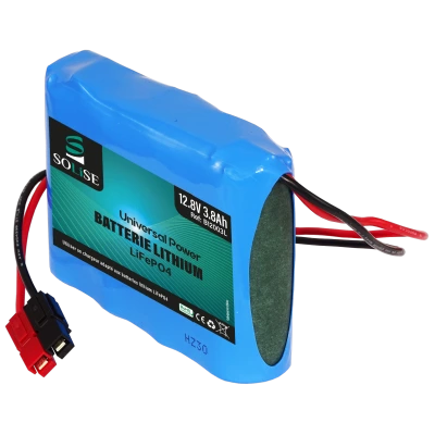 Batería de litio-hierro de 12 V y 3,8 Ah con sistema de protección BMS integrado. Muy duradera, con una vida útil de más de 2000 ciclos de carga/descarga.