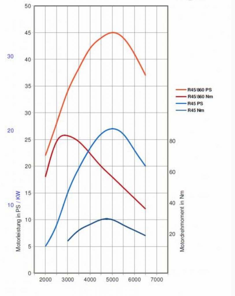 Even more drastic is the gain of the R 45: it already reaches its maximum torque of 70 Nm at 2240 RPM and with 30 % more power it puts a big smile on the faces of even the toughest riders of ''big'' motorcycles.