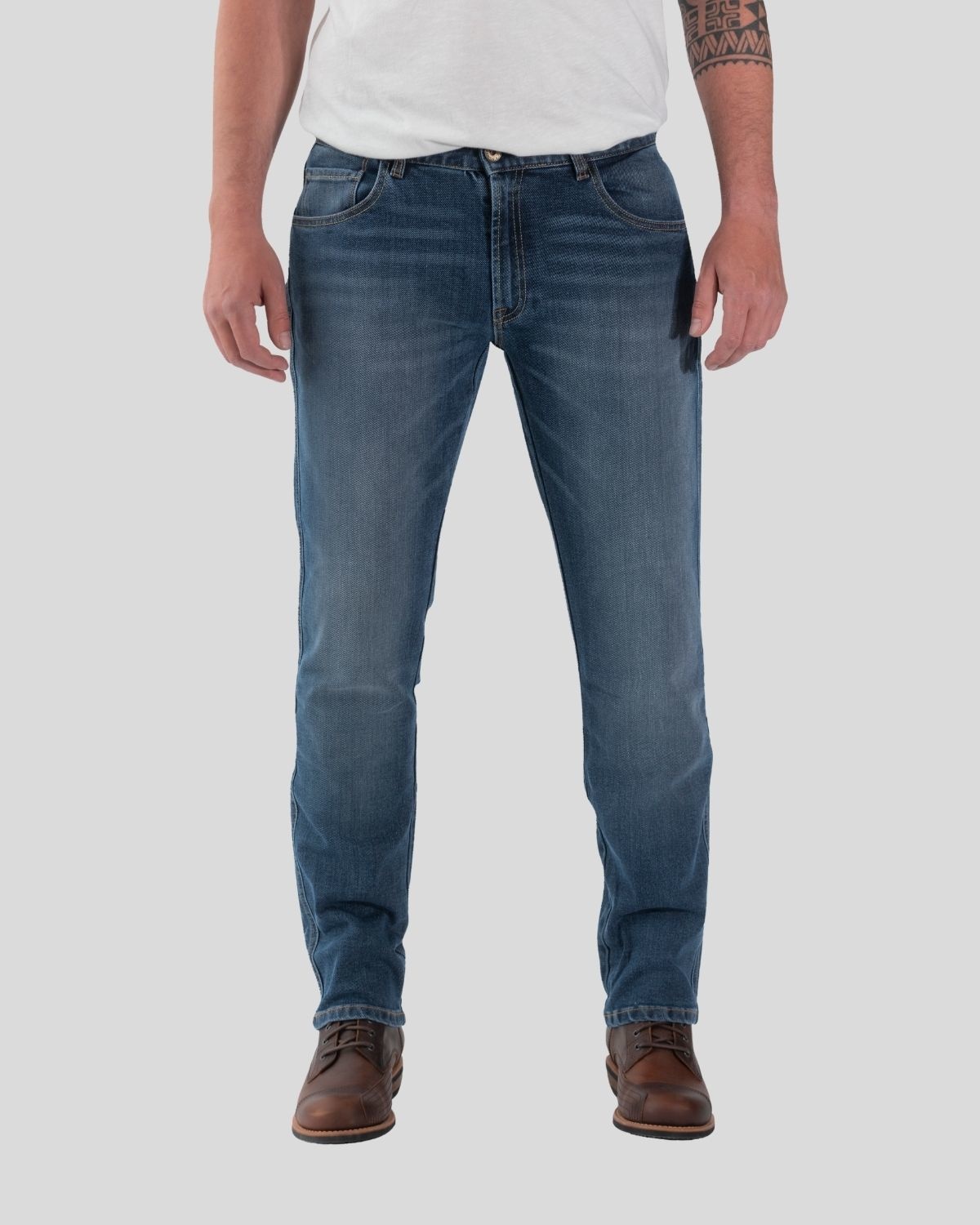 Jeans biker de una sola capa con cinco bolsillos y cremallera muy resistentes a la abrasión.