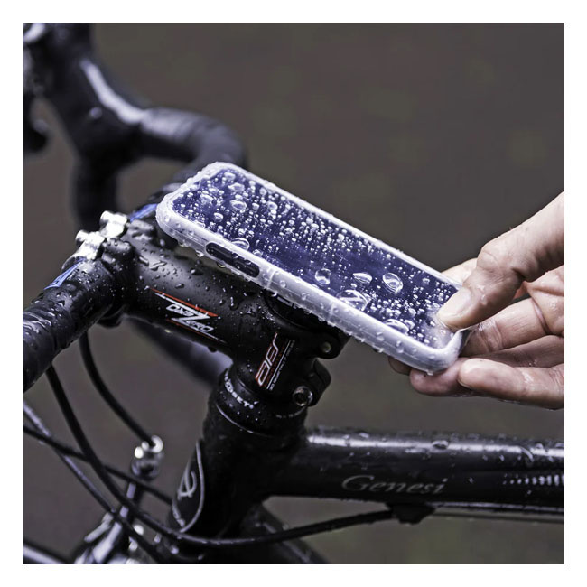 La funda SP Connect Weather Cover para iPhone añade protección adicional contra la lluvia, el polvo, el sudor y el barro cuando se utiliza con la funda SP Connect Phone Case. También proporciona una mayor resistencia a los golpes, manteniendo la funcionalidad completa de la pantalla táctil.