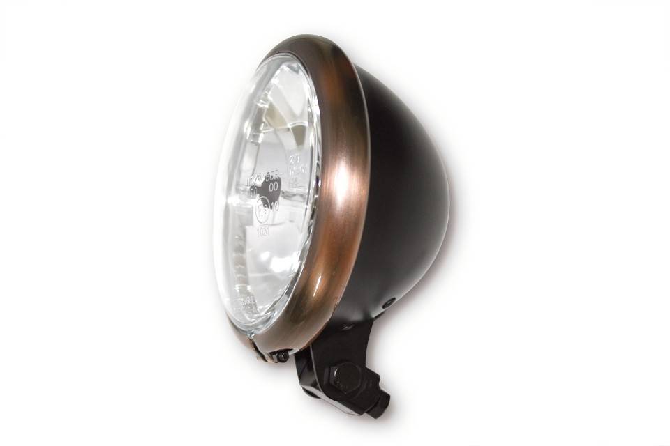 Phare avant 5,75" H4 Café Racer noir et cuivre avec homologation ECE. Attention, ce phare se monte par le bas.