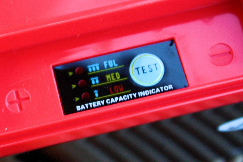Appuyez simplement sur le bouton de test. Si les 3 LED bleues s'allument, la batterie est complètement chargée (full). Si seulement 2 LED sont allumées, il n'est qu'à moitié (moyen) chargé. Au plus tard lorsqu'une seule LED est allumée (faible), la batterie doit être chargée.