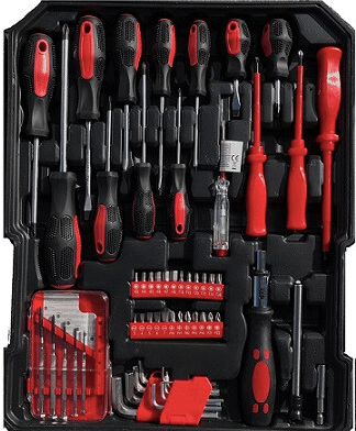 Besoin d'outils ? Un ensemble complet sera utile. Ce chariot à outils de 186 pièces possède une gamme très complète (voir ci-dessous). Les outils sont emballés dans une valise pratique, de sorte que vous pouvez facilement emporter tous les outils avec vous. Par exemple, l'étui est équipé d'une tige de traction extensible et d'une double serrure avec verrou.